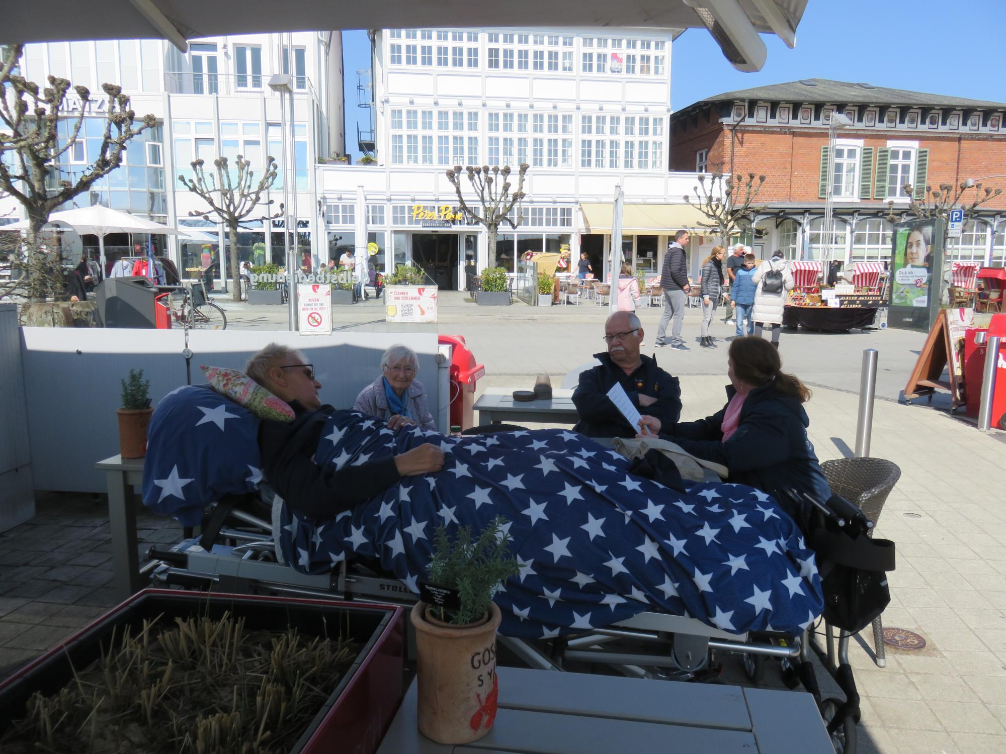 Im Nu waren wir in Lübeck angekommen, dem Geburtsort von Thomas. Hier nahmen wir nach einer herzlichen Begrüßung seine Mutter auf und steuerten schließlich auf Travemünde zu. Sehr schnell kamen wir zu dritt ins Gespräch. Beide erzählten mir, dass die Familie früher sehr gerne Tagesausflüge nach Travemünde unternommen hatte. So wurde mir sehr schnell klar, warum Thomas ausgerechnet diesen Ort als Ziel der Wunschfahrt ausgesucht hatte. Schließlich waren seit dem letzten Besuch dort immerhin fünf Jahre vergangen. In Travemünde angekommen, zog es uns alle zunächst an die Mole. Es war zwar etwas holprig, dort mit der Trage hinzukommen, aber … nichts ist unmöglich!