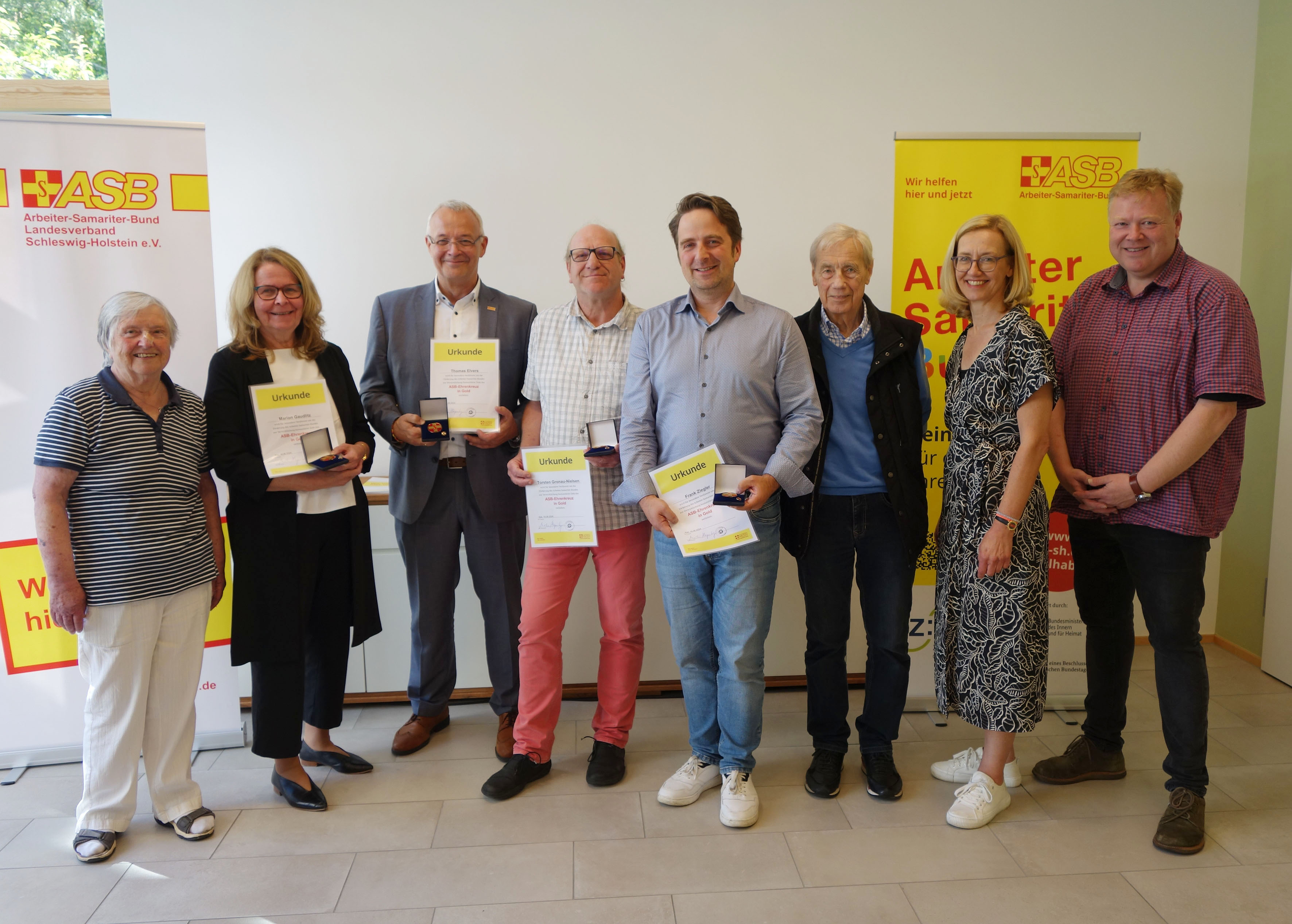 Ihnen zur Ehre richtete die Landesgeschäftsstelle ein Grillfest mit „Public Viewing“ zur Fußball EM aus. Leitungen und Vorstände aus allen acht Regionalverbänden feierten mit. Die Wege der vier im ASB-Landesverband Schleswig-Holstein zeichneten kurz ASB-Präsident Martin Kayenburg und ASB-Ehrenmitglied Heidi Beiß nach. Sie sind recht unterschiedlich, doch eines haben sie alle gemeinsam: Die Freude am Ehrenamt, das die Geschicke des Verbands lenkt und leitet.