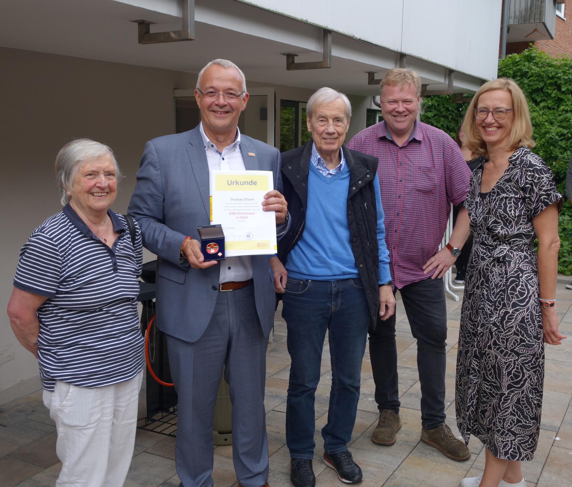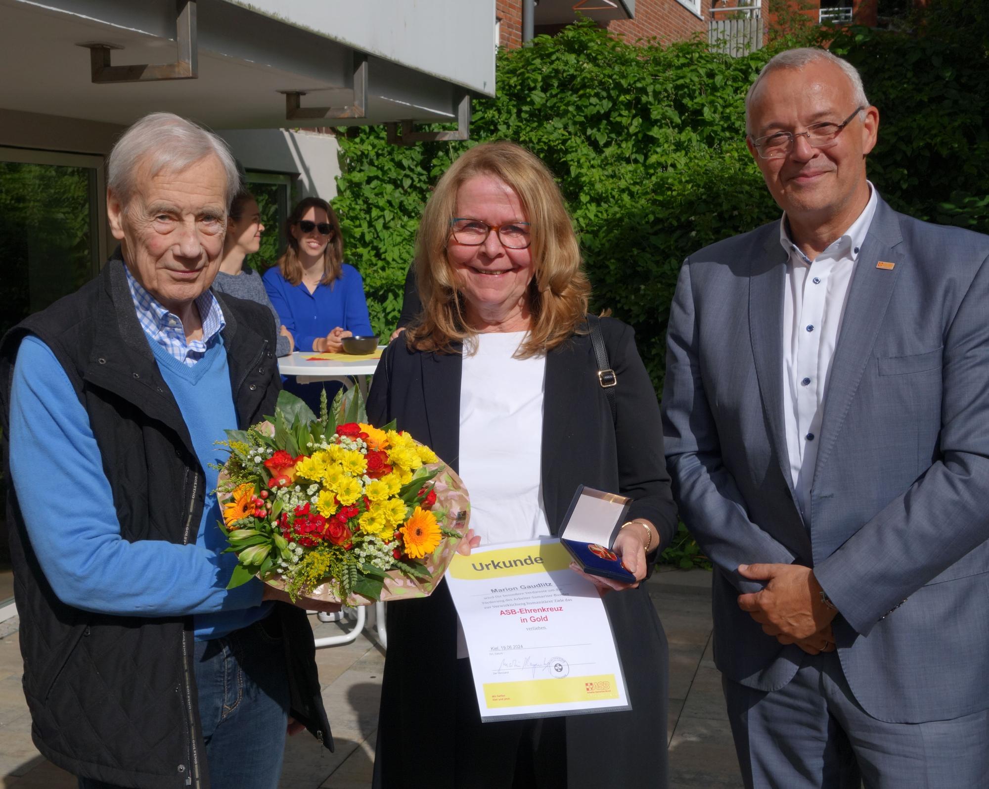 Auf zusammen 40 Jahre im Ehrenamt des ASB-Landesvorstands bringen es vier hochverdiente Samariter:innen, die dafür am 19. Juni mit der ASB-Ehrenmedaille in Gold ausgezeichnet wurden. Landesvorsitzender Thomas Elvers, seine Stellvertreterin Marion Gaudlitz, sein Stellvertreter Frank Ziegler und Vorstandsmitglied Torsten Gronau-Nielsen engagieren sich seit jeweils 10 Jahren in diesem anspruchsvollen Ehrenamt.