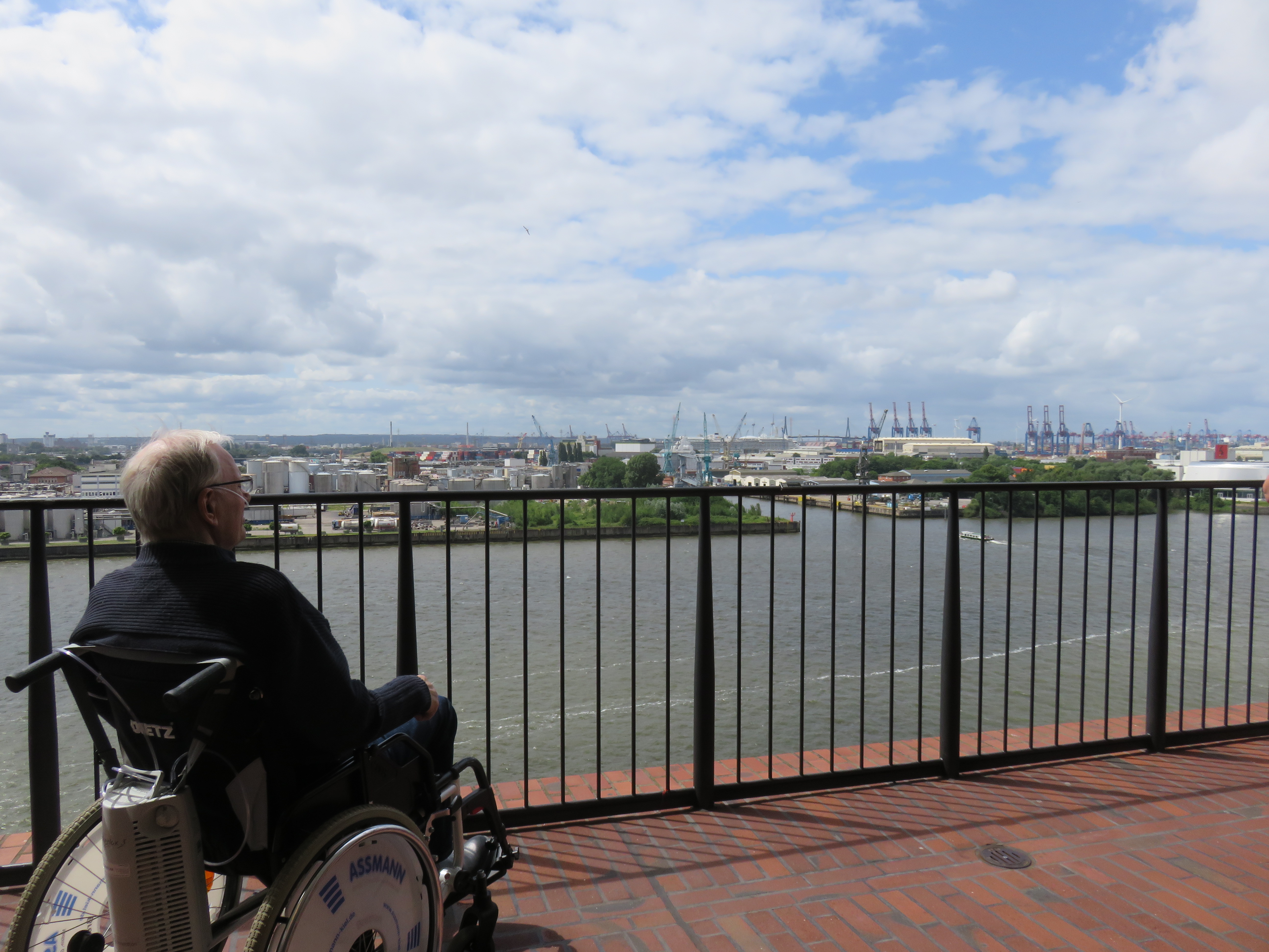 Bei strahlendem Sonnenschein erreichten wir die Elbphilharmonie, wo Schwiegertochter und Enkelsohn bereits warteten. Mit dem Fahrstuhl ging es hinauf auf die 37 Meter hohe Aussichtsplattform. Dort genossen wir gemeinsam den Blick über Hamburg. Die frische Luft tat Hansi sichtlich gut. Trotz seiner Lungenerkrankung kam er ohne zusätzlichen Sauerstoff aus. Seine Gesichtshaut war rosig, seine Haltung gelöst.