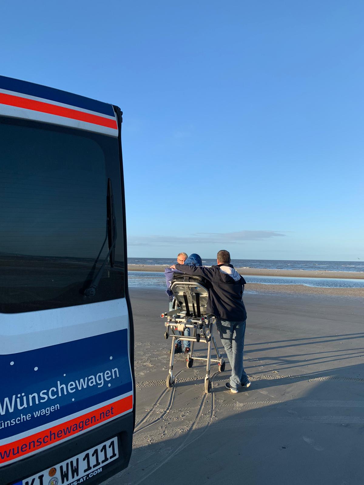 Auf der Heimreise war das Wünschewagen-Team aus Schleswig-Holstein an ihrer Seite. Bevor es zurück nach Süden ging, machten sie noch einen letzten Spaziergang am Strand und spürten die frische Nordseebrise – ein unvergesslicher Abschluss dieser besonderen Reise. Unser Team durfte sogar direkt ans Wasser fahren, was diesen Moment für das Paar besonders machte.