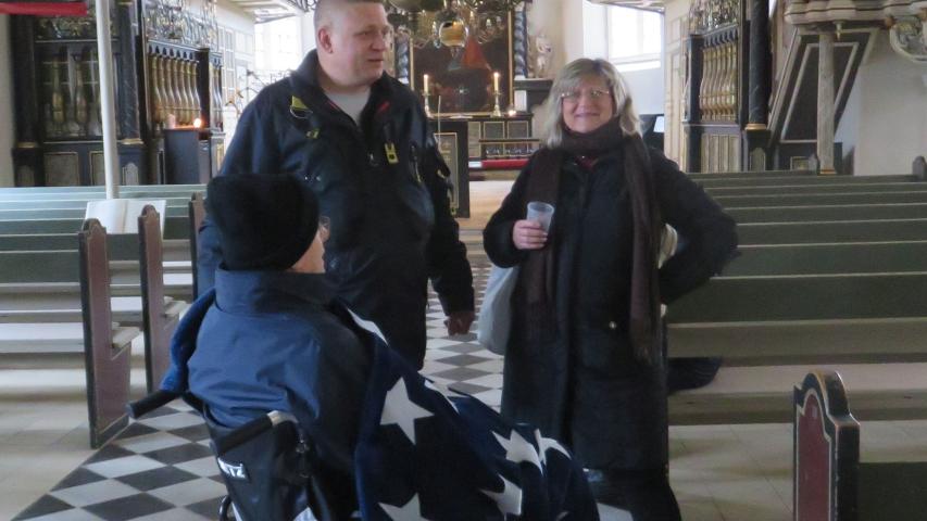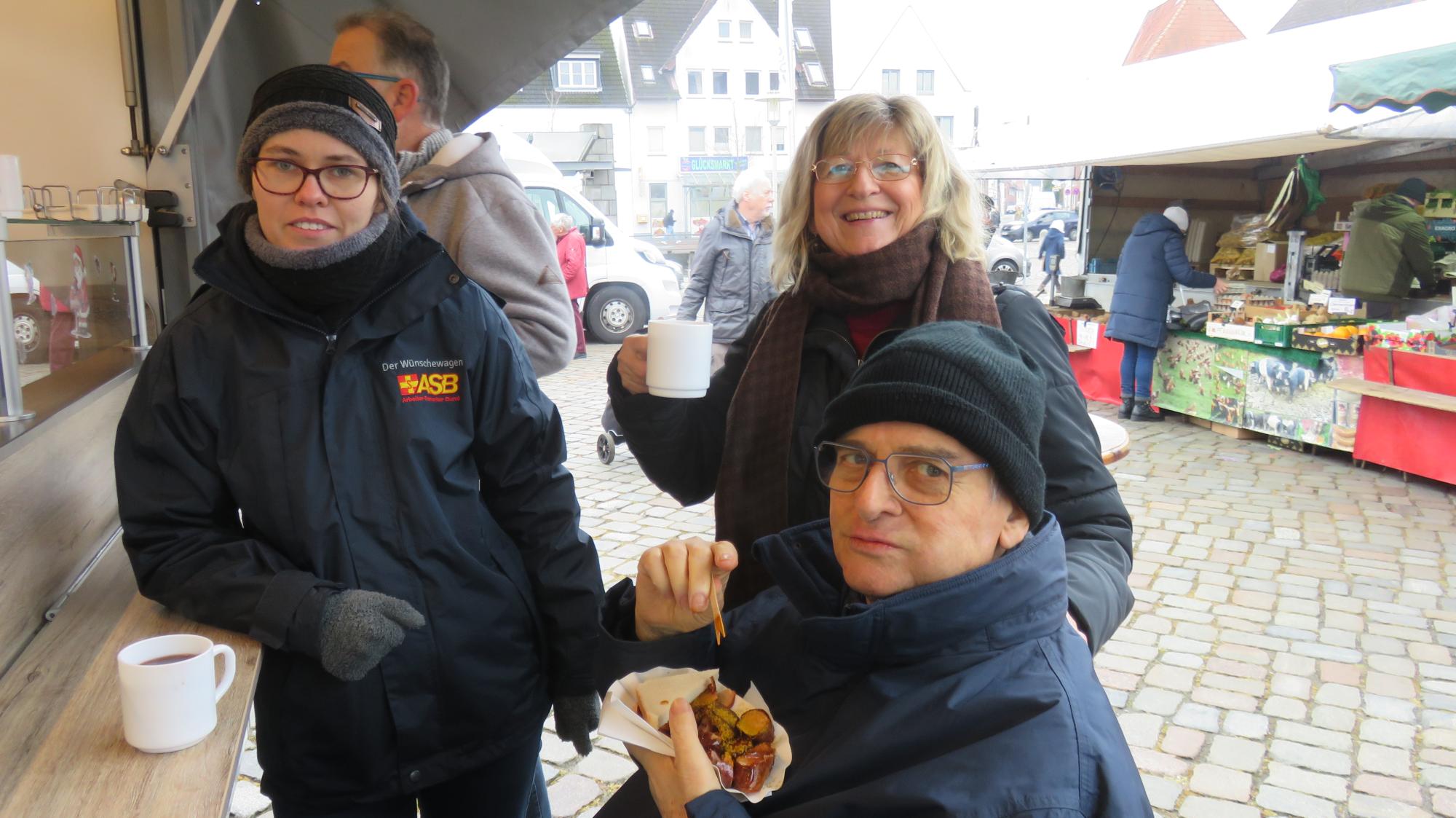 Dort angekommen, konnten wir mit unserem Wünschewagen direkt auf dem Marktplatz parken und zum ersten Ziel spazieren: dem Wochenmarkt. Herr R. wollte sich unbedingt sein Lieblingsbrot vom Bäcker mitnehmen und seiner Frau einen Blumenstrauß schenken. Außerdem gab es den ersten Glühwein in diesem Winter mit einer leckeren Currywurst für unseren Fahrgast. Kurzerhand gingen wir danach in die angrenzende Kirche, unterhielten uns nett für einige Zeit mit der Pastorin und konnten uns zudem von der Kälte ein wenig in der Kirche aufwärmen.