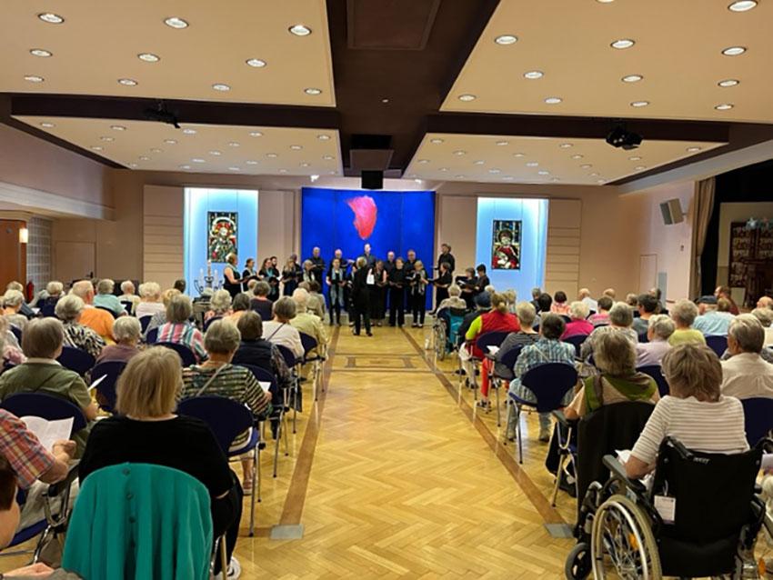 Nach der Stärkung machten wir uns dann also auf zum Konzert. Aus erster Reihe, direkt neben seiner Frau, konnte Dieter gut eine Stunde lang „seinem“ Chor lauschen. Es war Musik, die den meisten Menschen wohl eher unbekannt ist – eine Messe im alt-russischen a cappella gesungen, aber dennoch unheimlich schön. Auch wenn Dieter nicht mit uns sprechen konnte, sah man ihm die Freude an dem Konzert an. Die Sängerinnen und Sänger haben Dieter offensichtlich eine große Freude mit dem Konzert bereitet. Er hat bekannte Stücke wahrgenommen und man hat ihm angesehen, wie traurig er war, als das Konzert vorbei war. Eine Sängerin hat es nach dem Konzert sehr treffend formuliert: „Wenn man jemanden sonst nicht mehr erreicht – die Musik kommt dennoch an.“
