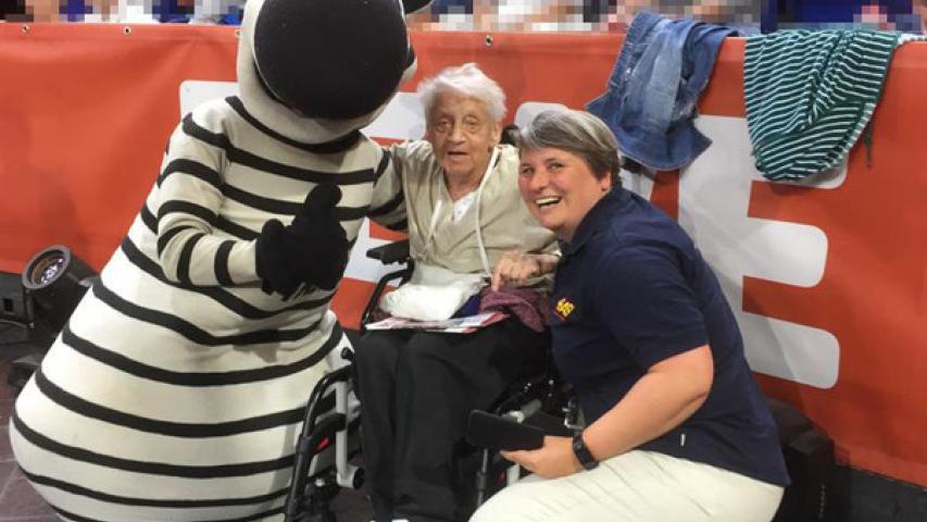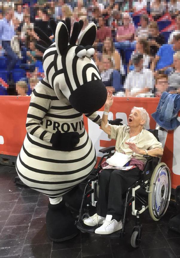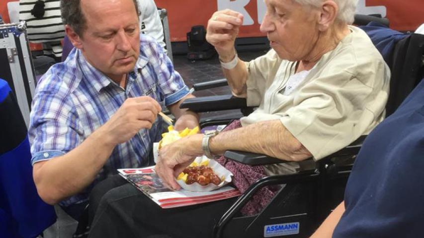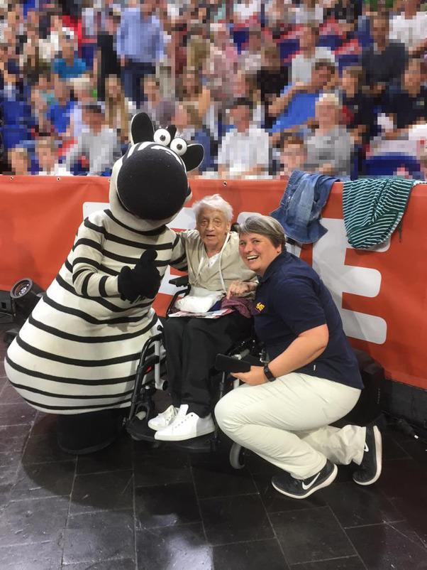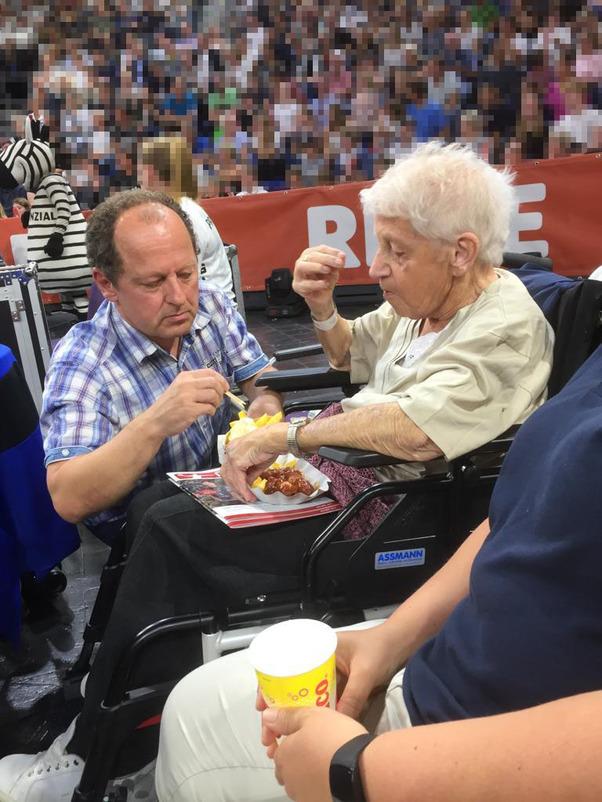 Ihr Sohn Dirk begleitete sie in die Sparkassenarena. Dort war sie beim Spiel voll dabei, klatschte begeistert und wippte bei der Musik mit. Und da Sport auch beim Zusehen hungrig macht, durfte es in der Halbzeitpause noch eine Currywurst mit Pommes sein. Frau R.s persönliches Highlight war aber das Foto mit THW-Maskottchen Hein Daddel. Und dass die Kieler ihr letztes Testspiel vor dem Saisonbeginn mit einem 34:30-Sieg über den französischen Serienmeister Paris St. Germain beendeten, trug natürlich auch zur guten Laune bei.