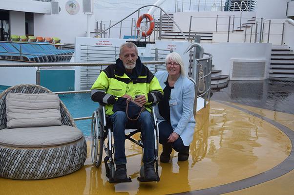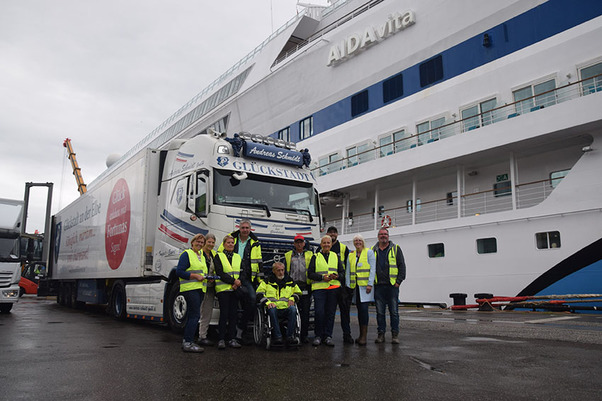 Alle gemeinsam durften wir, mit Sicherheitsschuhen und -westen ausgestattet, in den Sicherheitsbereich auf die Pier gehen. Dort wurde die AIDA Vita, die Reimer schon von vielen Arbeiten kannte, beladen. Alle Kollegen, die Reimer kannte, ob von der AIDA oder der Andreas Schmidt GmbH, kamen vorbei. Die Freude war groß, mit den Kollegen zu reden. Reimer sammelte alle seine Kräfte an diesem Tag zusammen, und wir hatten das Gefühl, dass er einfach dahin gehört. Auch sein Chef nahm sich die Zeit und besuchte unseren Fahrgast.