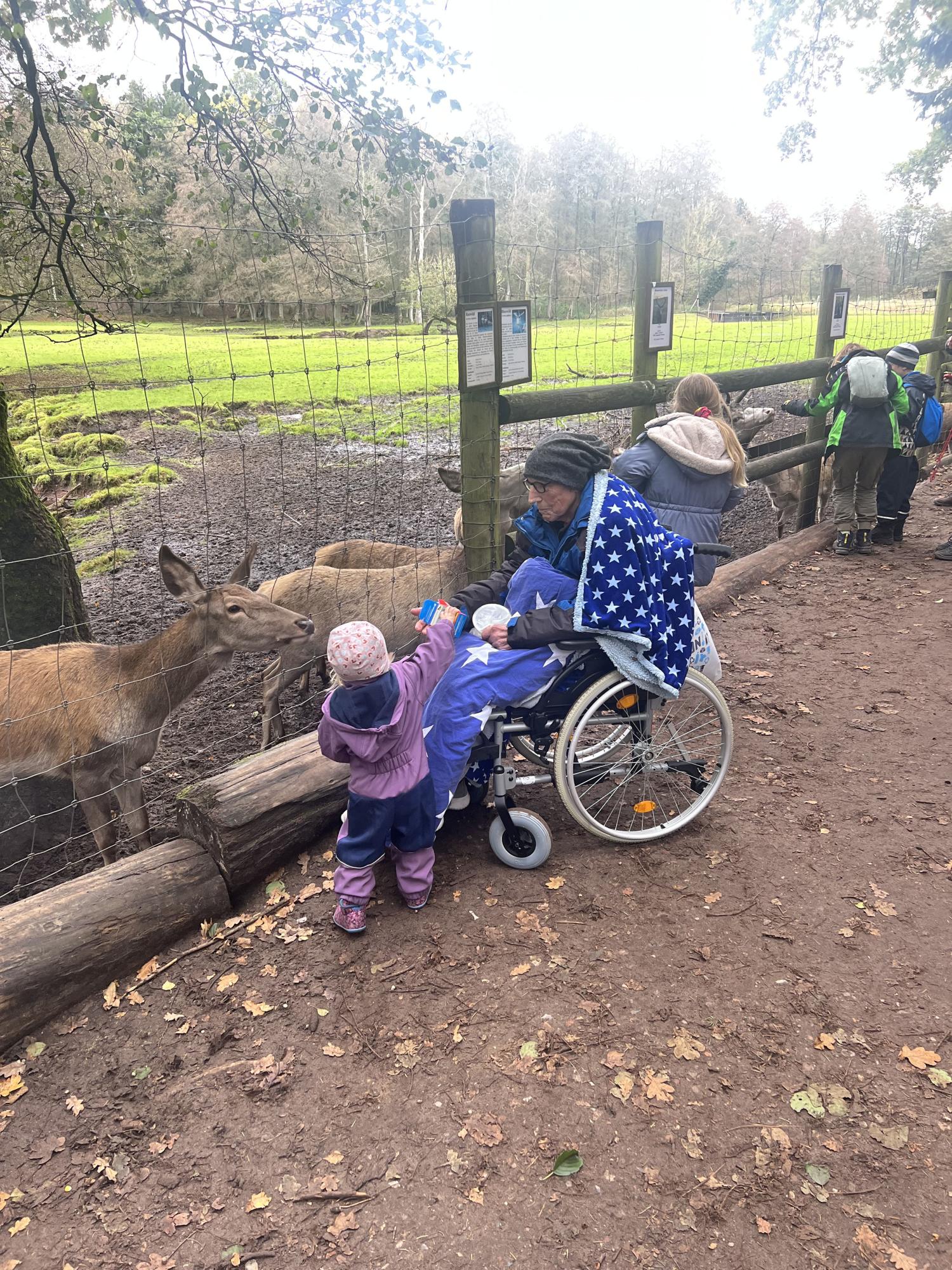 Und so ging es langsam auf die kleine Rundtour. Die Kinder hatten ihren Spaß, tollten und spielten, bestaunten die Tiere, fütterten sie und versorgten „Opa“ auch immer mit dem Wildtierfutter, der dann die Tiere gemeinsam mit seinen Enkeln fütterte und streichelte. Die meiste Zeit jedoch beobachtete Herbert, wie ausgelassen seine Enkelkinder die Zeit im Wildpark genossen, und immer wieder war ein Lächeln in seinem Gesicht zu sehen.