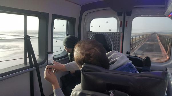 Um kurz nach 7 in der Früh ging die Reise los. Unser Fahrgast nebst Frau nahm im Wünschewagen Platz, seine drei Kinder, begleitet von Anja Ihben, im Mannschaftstransporter der FF Norderstedt. Da das erste Ziel Niebüll frühzeitig erreicht wurde, blieb noch Zeit für eine kleine Stadtrundfahrt. Während die drei Kinder im Regionalexpress nach Sylt fuhren, nahm der Rest der Gruppe mit dem Wünschewagen den DB Sylt Shuttle, welcher uns mal wieder hin und zurück komplett kostenlos beförderte. Dank bester Plätze genoss unser Fahrgast den freien Blick nach hinten raus.