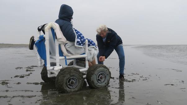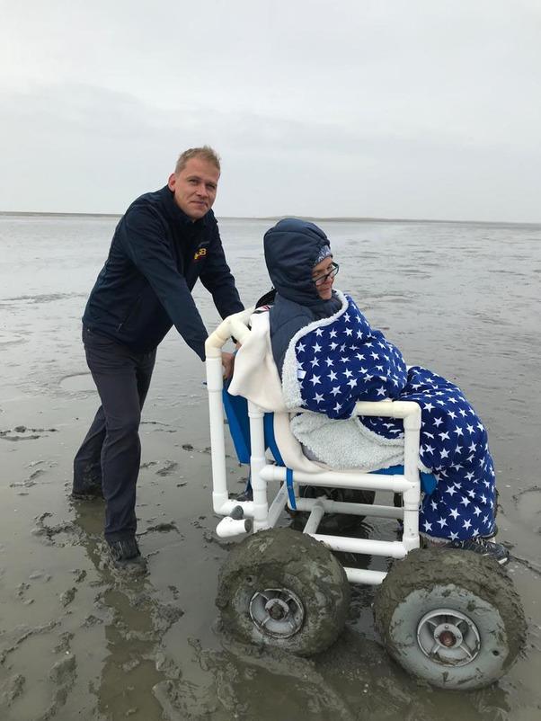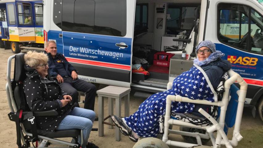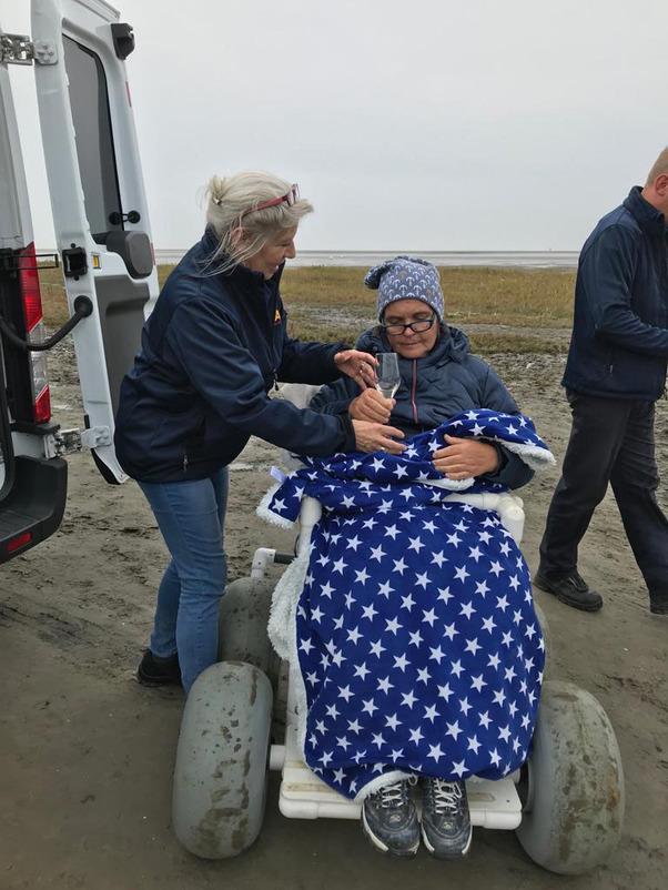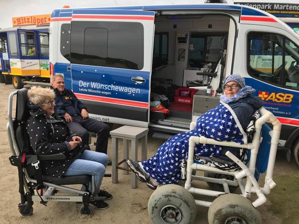 Beim Zwischenstopp in Husum genoss es die schwerkranke 56-Jährige sehr, das erste Mal wieder salzige Luft zu riechen und Schiffe zu gucken. Für unsere Wunscherfüller Andre Bredemeier und Elisabeth Klingenhoff gab es viel zu organisieren, da der Strand in Sankt Peter Ording über Nacht unbefahrbar geworden war. Also entschied man sich für den Südstrand, wo man sehr dicht ans Wasser fahren kann. Die Tourismus-Zentrale sorgte wie so oft sofort nach unserer Ankunft dafür, dass wir kostenlos einen Strandrollstuhl gebracht (!) bekamen und mit dem Wünschewagen noch etwas dichter ans Wasser durften. Ein großes Dankeschön dafür!