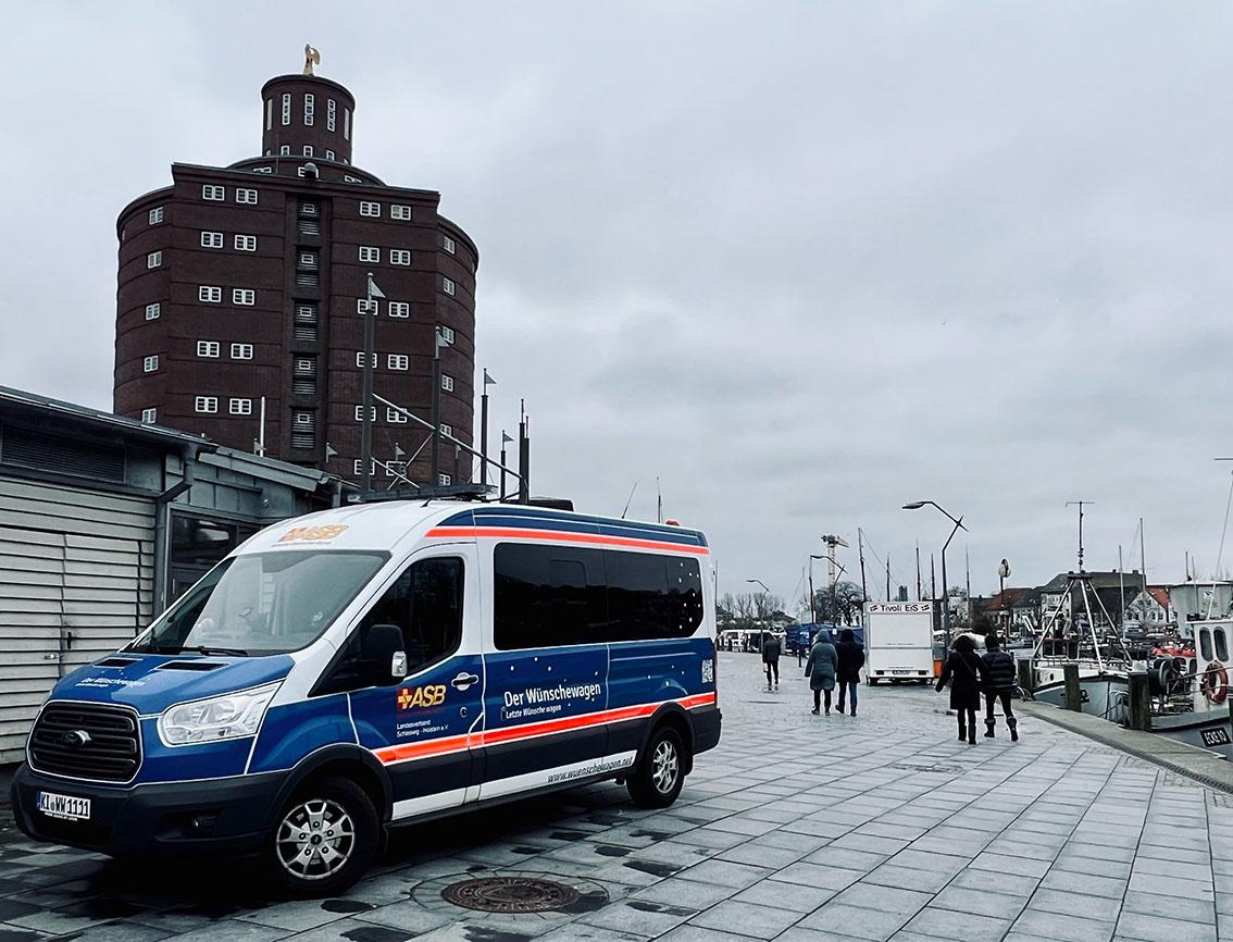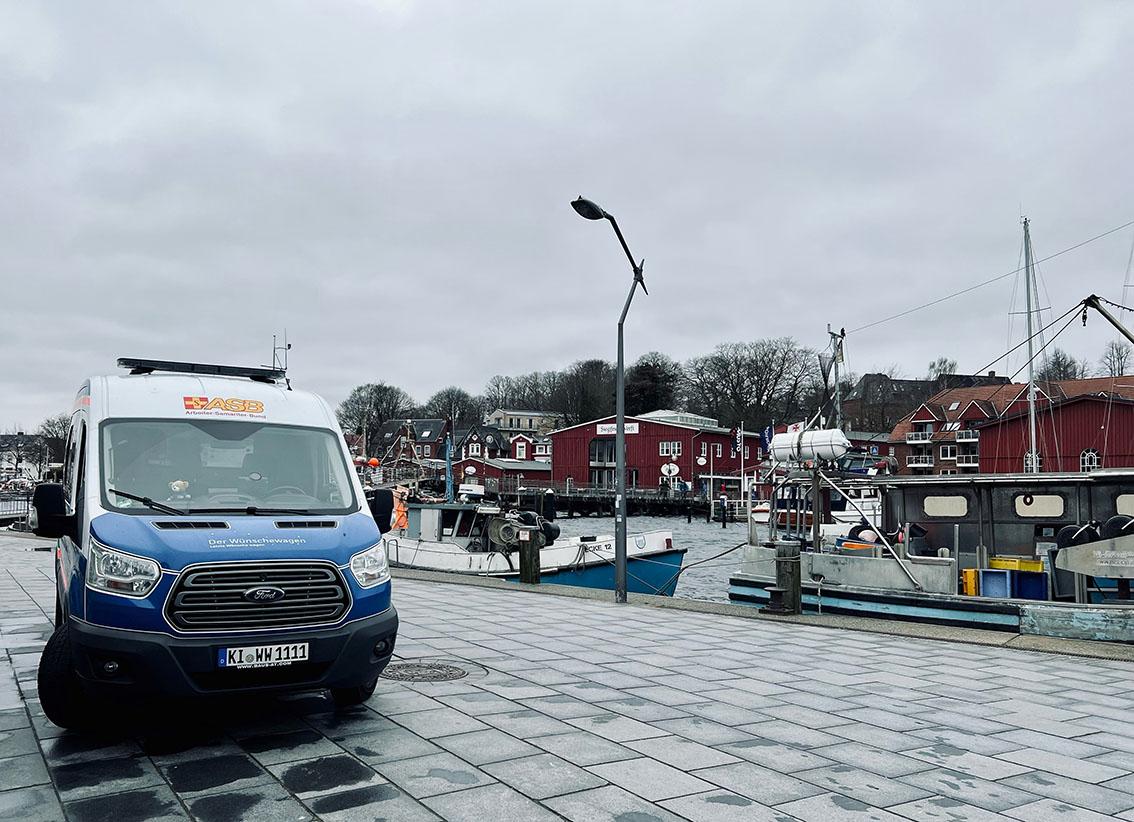 Mit dem Wünschewagen ging es am Kieler Hafen vorbei an den großen Fähren. An der Kiellinie schwappten die Wellen fast bis zur Straße, die Stege im Yachthafen waren trockenen Fußes nicht mehr zu passieren. Es gab ordentlich was zu gucken für unseren Gast.