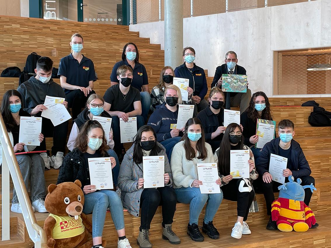 Pro Schuljahr werden rund 15 bis 20 Schulsanitäterinnen und Schulsanitäter ausgebildet. Zu deren Aufgaben gehören das Sichern und Unterstützen der Erste-Hilfe-Versorgung im Schulalltag, das Dokumentieren der Einsätze, das Erstellen der Dienstpläne sowie das regelmäßige Fortbilden. „Wir sind sehr glücklich, dass wir wieder eine so praxisorientierte Ausbildung trotz der Corona Situation durchführen konnten. Wir wünschen allen viel Erfolg und ein gutes Händchen in ihren Einsätzen“, so ASB Ausbilderin Imke Steffen.